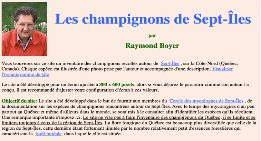 En novembre 2006, le groupe Flickr Champignons du Québec est créé dans le but de réunir les mycologues photographes de partout au Québec et d’ainsi parvenir à élaborer un répertoire photographique de tous les champignons de la province en se basant sur les listes établies par le Cercle des mycologues amateurs de Québec et le Cercle des mycologues de Montréal ainsi que sur les ouvrages de base publiés à l’époque. Un premier site web est lancé le 4 décembre 2007 sous le nom de mycoquebec.org dans le but de mieux organiser les connaissances accumulées et de rendre le matériel du groupe Flickr accessible à tous.![]() 1980 ![]() 1997 ![]() 2003 ![]() 2006 ![]() 2006 Été 2008Le groupe s’enrichit considérablement en obtenant la permission d’ajouter les descriptions d’espèces et les photos des collections de Sept-Îles publiées par Raymond Boyer sur son site web (encore disponible sur https://raymondboyer.mycoquebec.org) et aussi celles publiées sur le CD-ROM Mille et un champignons du Québec du Cercle des mycologues de Montréal. À l’automne 2008, le groupe Flickr compte désormais 5 000 photographies représentant quelque 1 500 espèces.![]() ![]() 2010Avec la collaboration maintenant assurée des meilleurs mycologues du Québec, le groupe continue d’accumuler photos, descriptions et clés d’identification. Début 2010, le site atteint les 2 100 espèces illustrées par plus de 10 000 photos et propose une nouvelle version de mycoquebec.org. Les collaborateurs de Mycoquébec ont réussi à illustrer la quasi-totalité des espèces ayant été observées sur le territoire québécois. En août, Mycoquébec obtient ses lettres patentes en tant qu'organisme sans but lucratif voué à l’acquisition des connaissances et à la promotion de la mycologie.2013